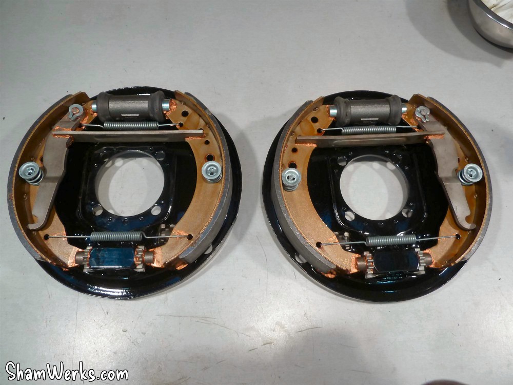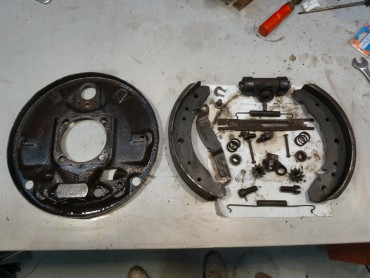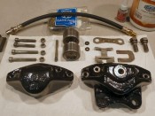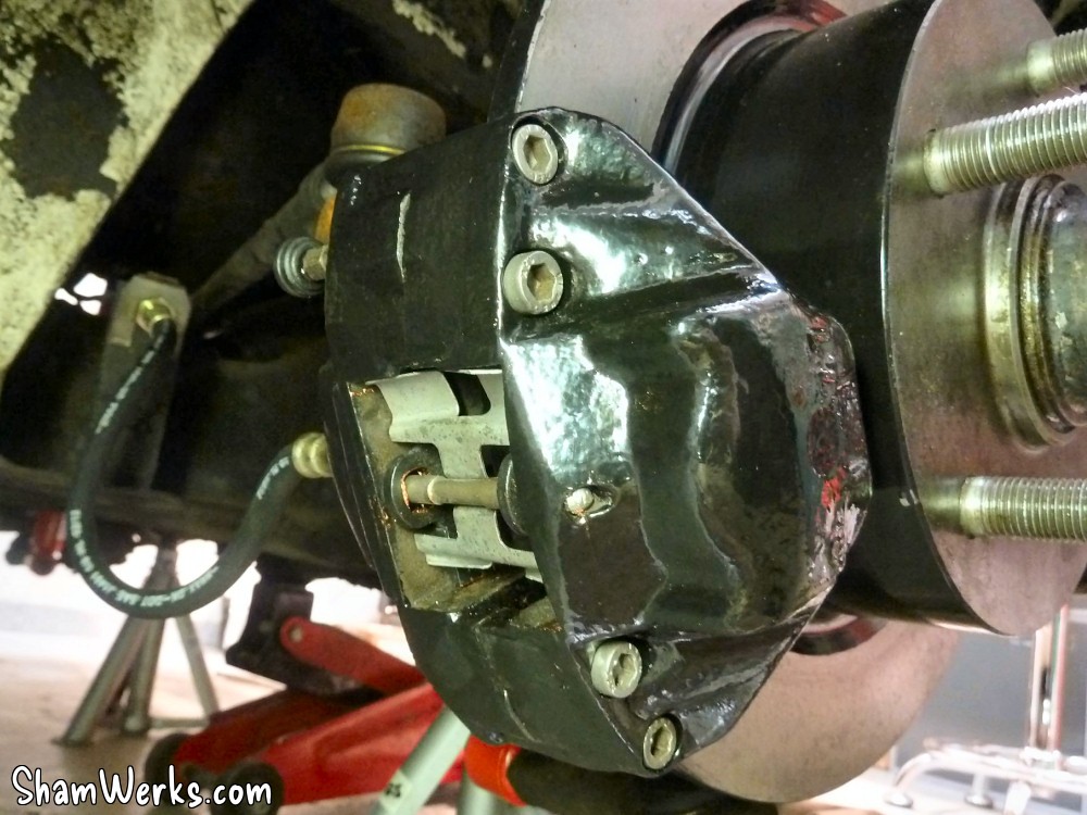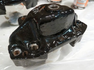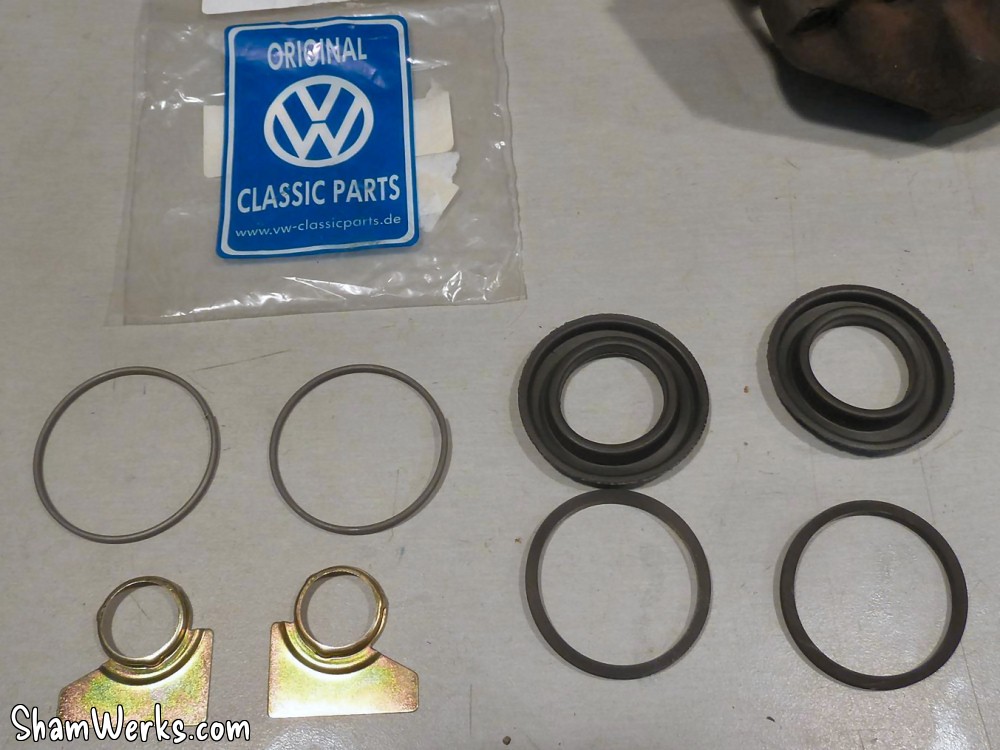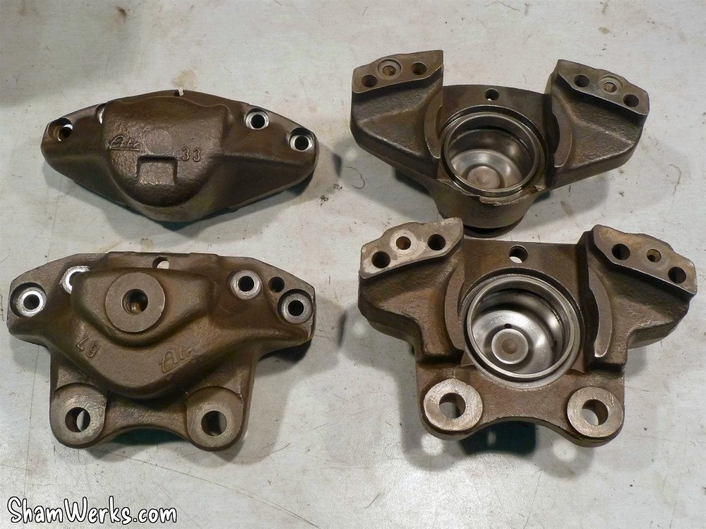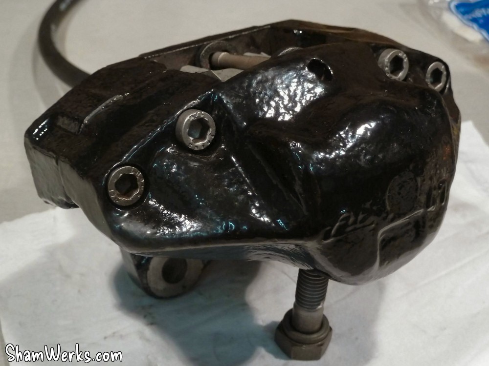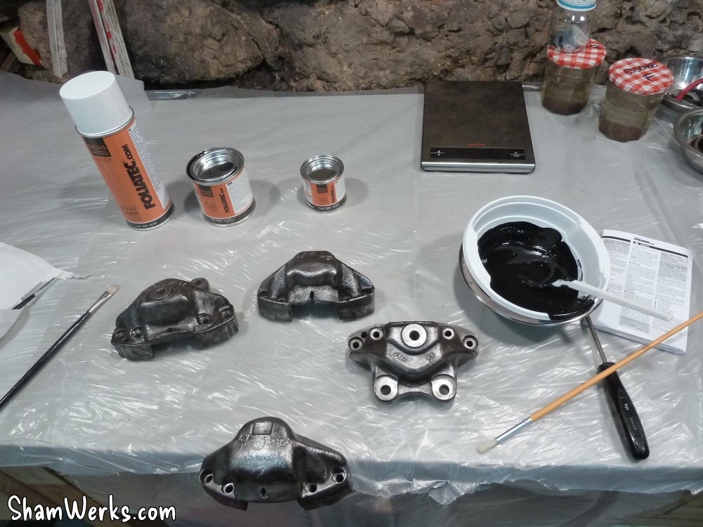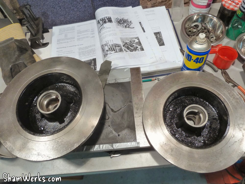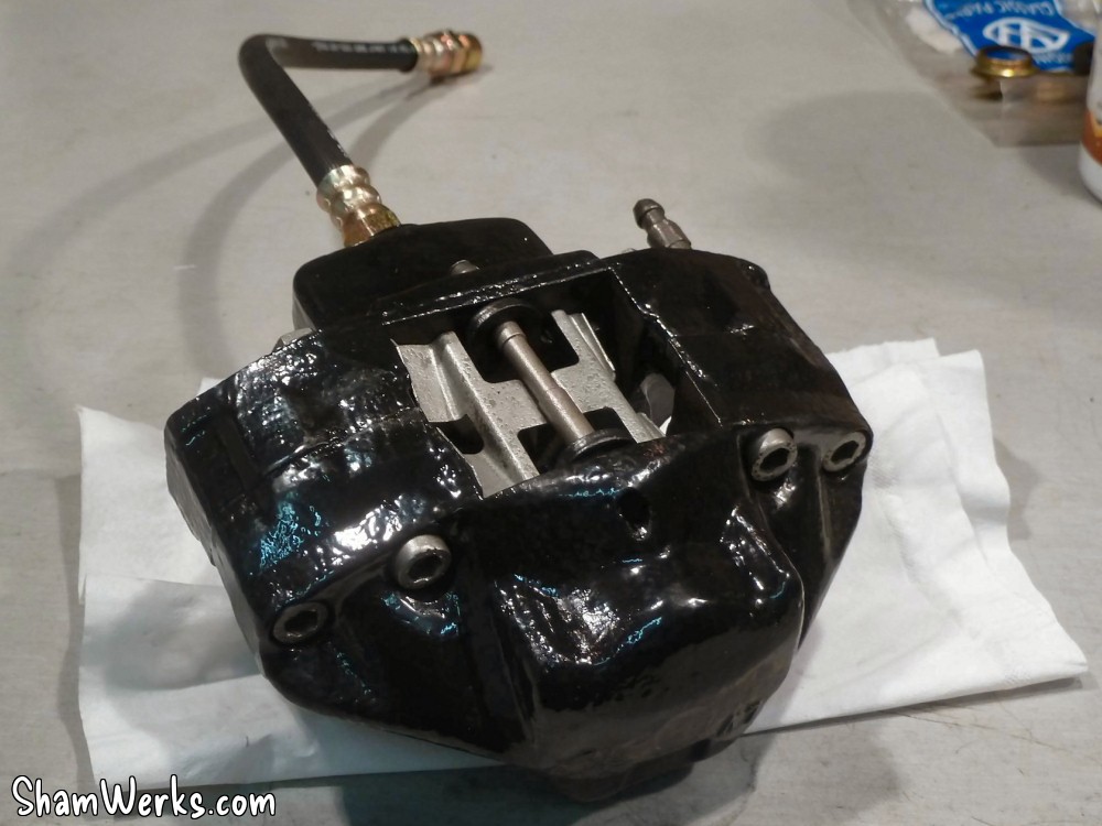 Changement des disques et roulements par du neuf (merci Laurent!), et réfection complète des étriers : kit réfection VW Classic, plaquettes et flexible neufs, boulonnerie microbillée, étriers peints (kit Foliatec). Je voulais les peindre en rouge au départ, mais finalement je trouvais ça trop "bling", noir brillant c'est quand même plus classe.Pourquoi les peindre? Pour ne pas avoir un vilain étrier rouillé qui apparaît au travers des branches des Fuchs! 😉