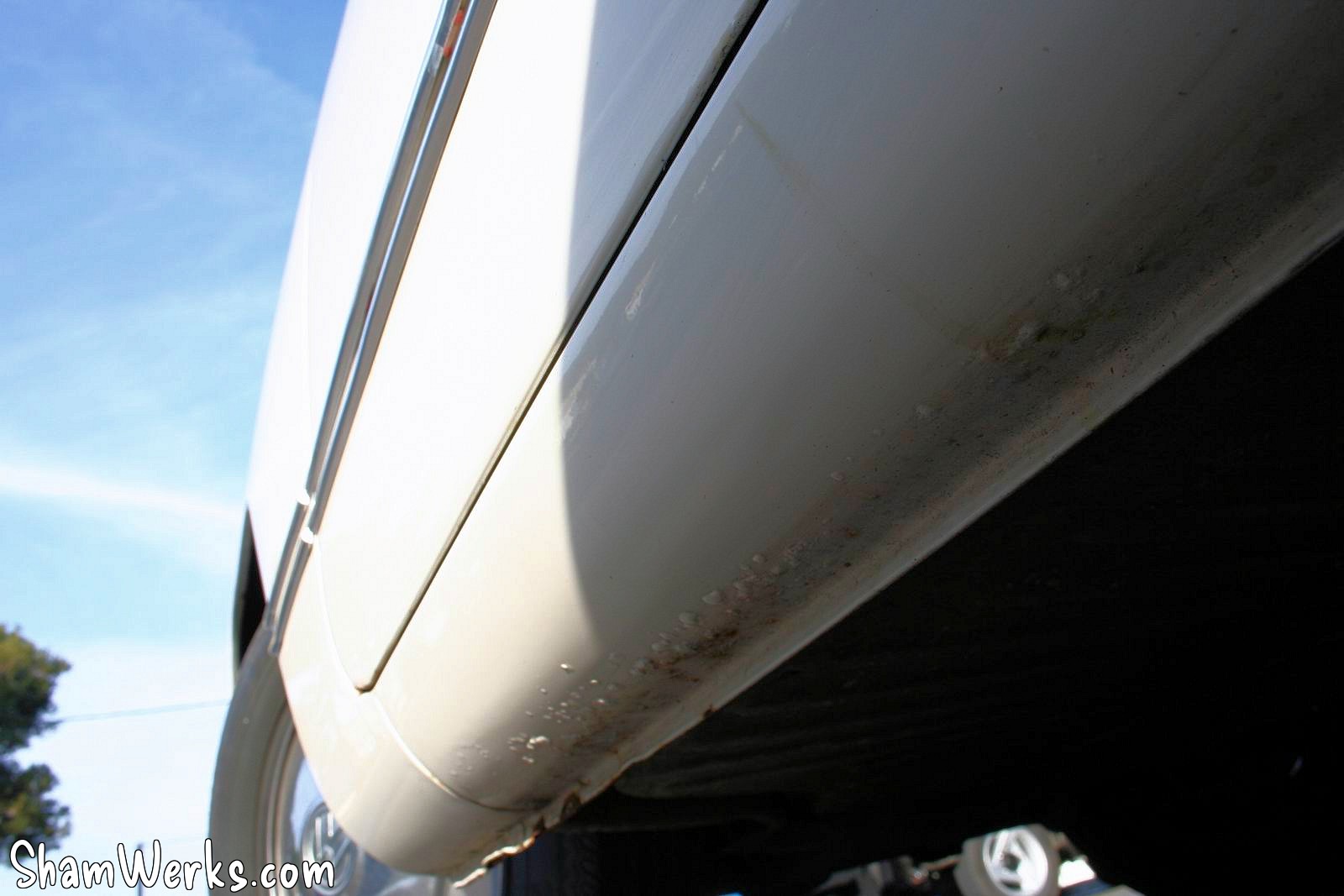 Pas de corrosion dans les passages de roue, les longerons sont propres (juste quelques cloques d'un coté), l'aimant n'a décelé aucun mastique. Pas de rouille sur la baie de pare-brise, un ou deux points sur la lèvre inférieure du capot arrière.