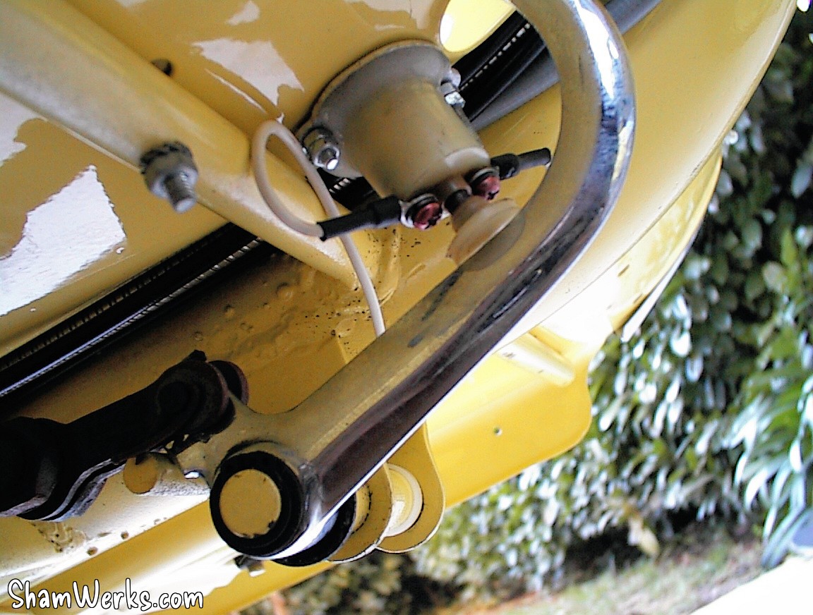 On voit le résultat final sur la photo de droite. Quand on appuie sur la pédale, le contacteur se détend, et ferme le circuit, qui allume le feu de frein à l'arrière.