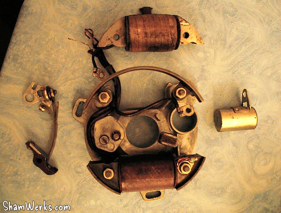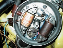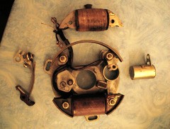 Une maladie sur ces modèles, c'est la bobine haute tension qui vieillit mal, et conduit à un mauvais allumage. Heureusement le Lambretta Club de France me fourni une bobine HT rebobinée, et je remonte tout en neuf : bobine, vis platinées, contact HT, condensateur... Au moins j'aurai l'esprit serein de ce coté là!
