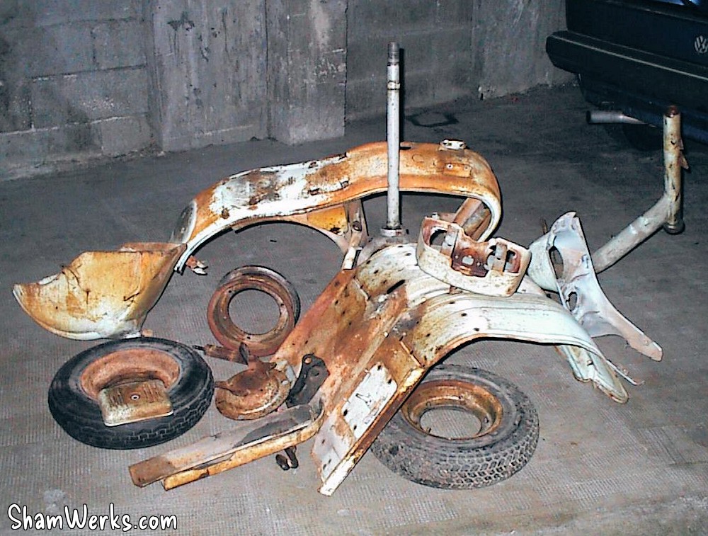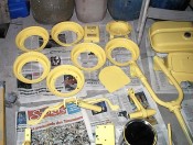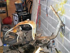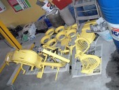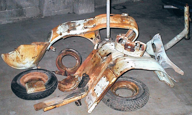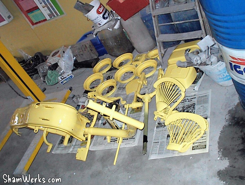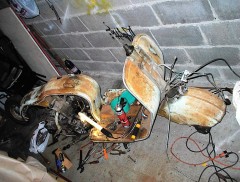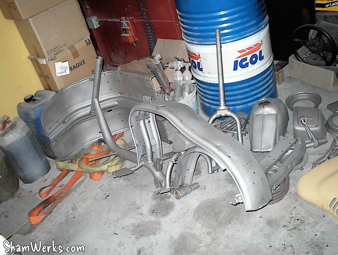 En avant, direction le sableur : le tablier avant, la boite a gants, les 3 jantes, le support de roue de secours, frontal avant, les deux prolongateurs de marche pieds, l'amortisseur arrière, la béquille, le boitier de protection du redresseur de courant, la fourche, le garde boue avant, et évidemment, le cadre, partent se refaire une beauté.