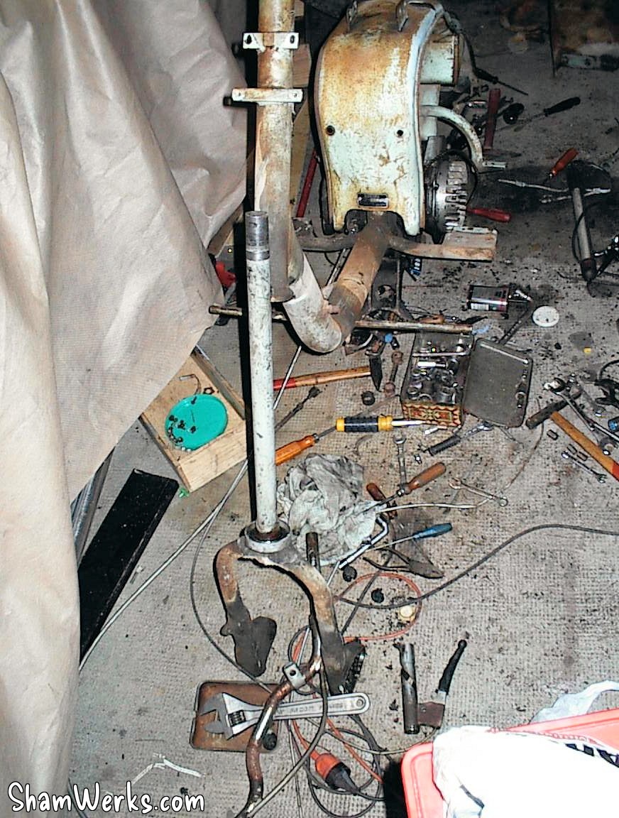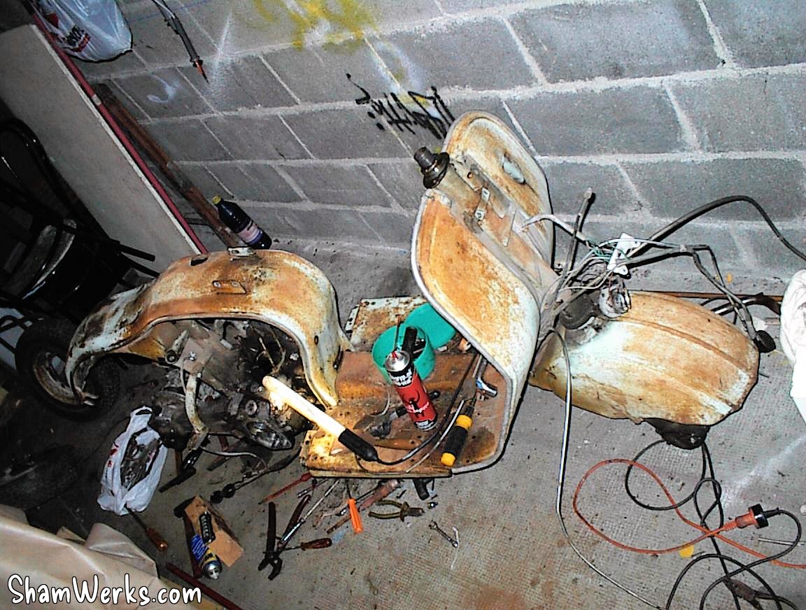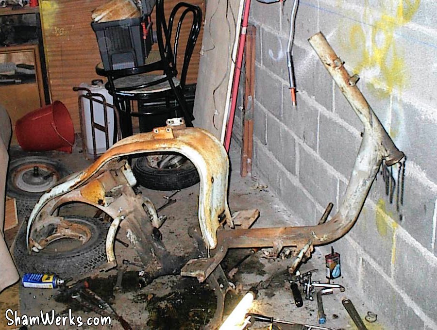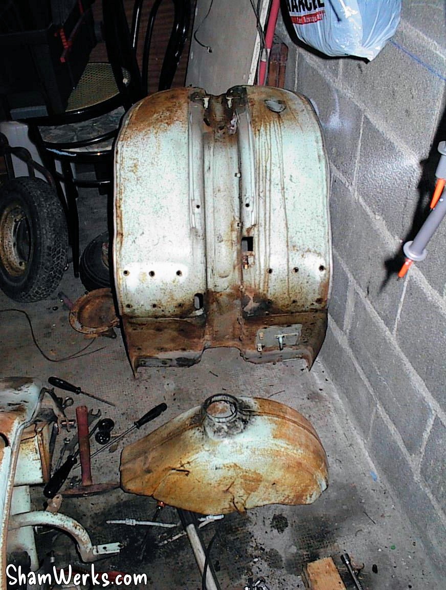 En avant, direction le sableur : le tablier avant, la boite a gants, les 3 jantes, le support de roue de secours, frontal avant, les deux prolongateurs de marche pieds, l'amortisseur arrière, la béquille, le boitier de protection du redresseur de courant, la fourche, le garde boue avant, et évidemment, le cadre, partent se refaire une beauté.