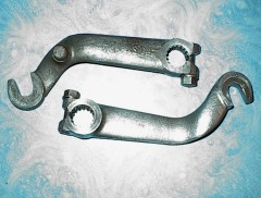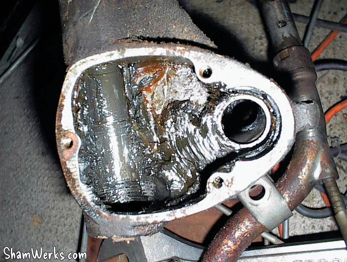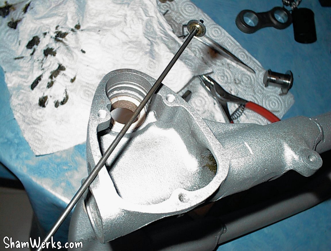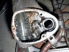 - A gauche le boitier de suspension, vidé du ressort, de l'axe et du bras de suspension. La graisse a 44 ans, et la grenaille de tungstène du sablage était reste prisonnière dedans... Je me suis donc fabriqué un outil (une corde a piano avec une rondelle soudée au bout) pour pouvoir vider le tube de cette graisse viciée... Un jeu d'enfant avec mon outil! Je dépose un brevet?... 😁