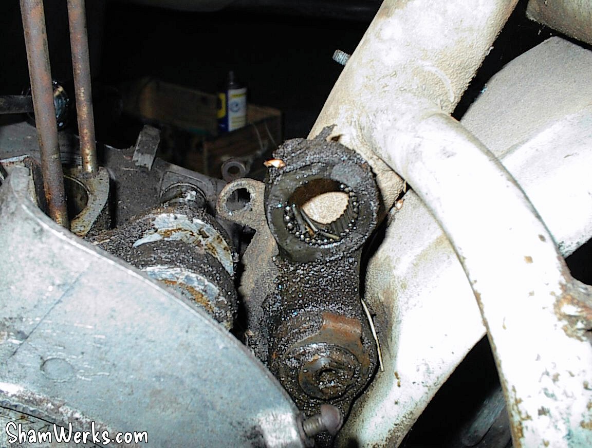 ET LA ! Surprise! Alors que l'axe saute, plein de petits rouleaux foutent le camp! Regardez la photo (si si, derrière la graisse, la crasse, les aiguilles de pin...) : eh oui, un roulement a aiguilles sans cage! Même gag que pour les deux roulements de la fourche.