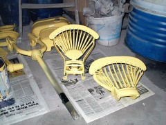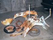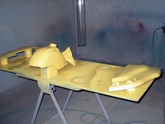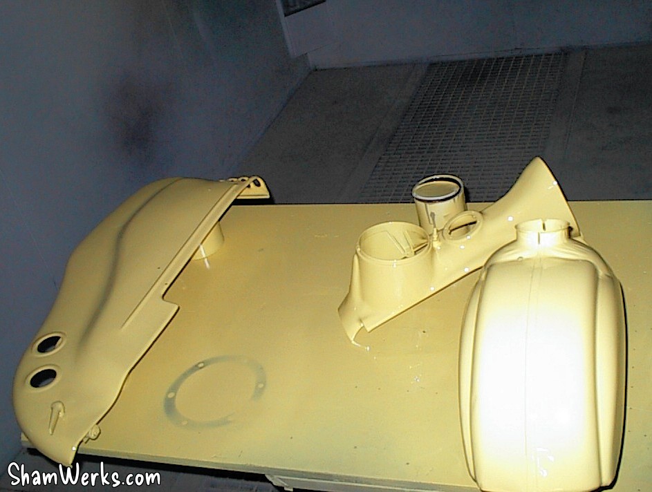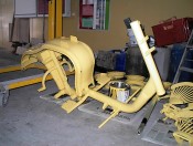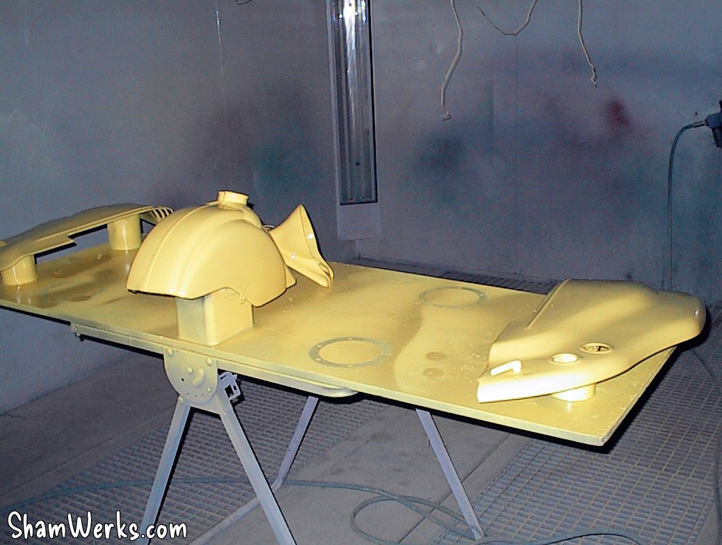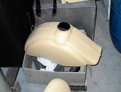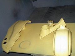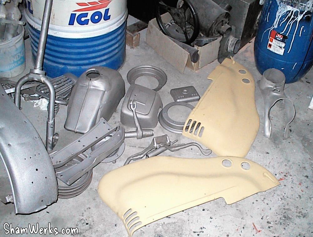 Au retour du sablage, toutes les pièces vont chez le carrossier. Il est important de ne pas trop attendre entre le sablage et la mise en peinture (ou au moins en apprêt), car la tôle, mise a nue, est piquée par la rouille en 2 à 3 jours (selon taux d'humidité).