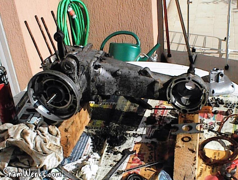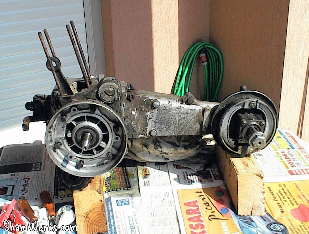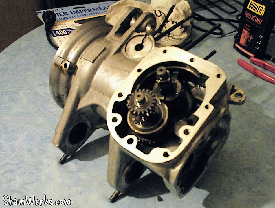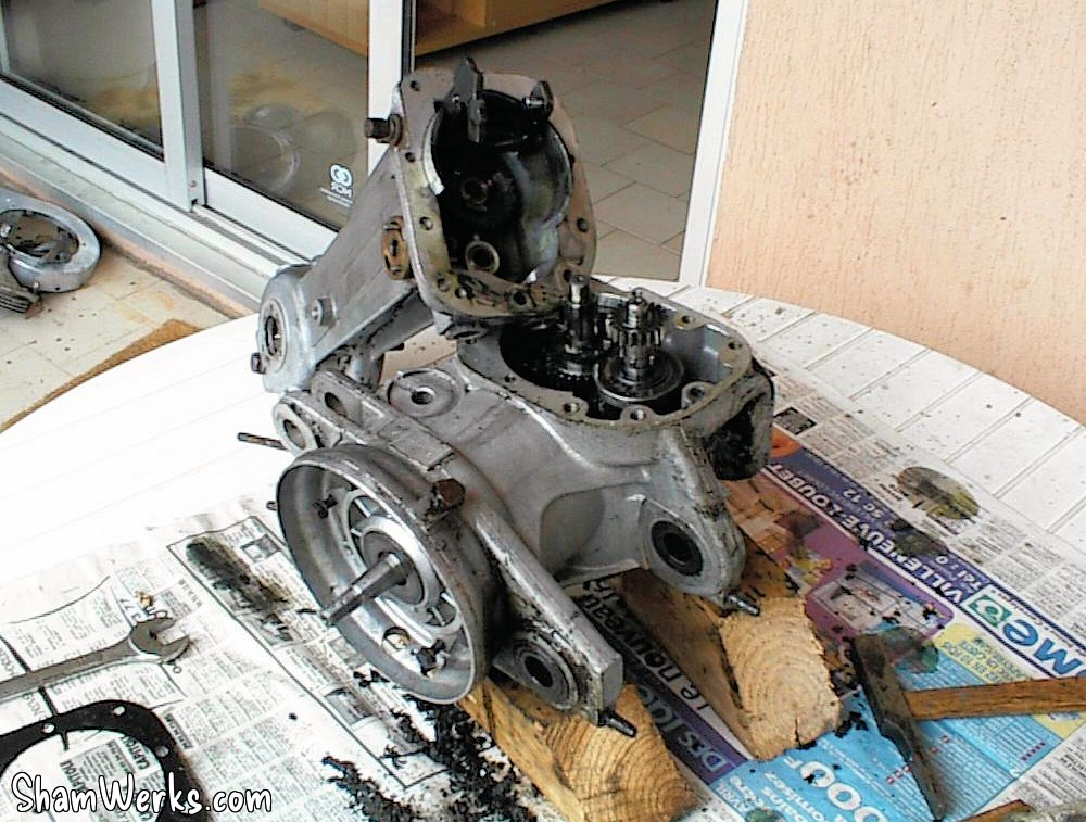 J'attaque le grand nettoyage du moteur... La couche de graisse était tellement épaisse qu'elle masquait le goujon que je devais enlever pour séparer la transmission du bloc moteur!