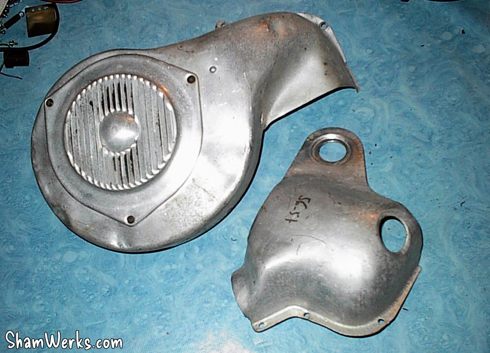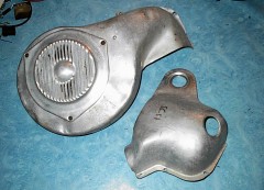 Les tôles en aluminium de refroidissement moteur : ces pièces, assez fines et fragiles, sont de plus en plus difficiles a trouver dans cet état! De plus, mon modèle (1956) requiert un type de tôle particulier pour laisser passer sa pipe d'admission en aluminium rapportée. Ouf, c'est le bon modèle de tôle, un coup de chance!