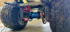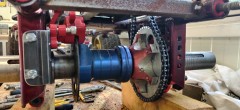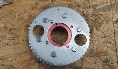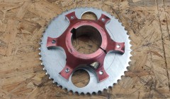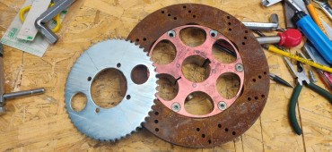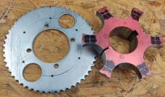 To adapt the sprocket on the rear axle, I used a brake hub I found on one of my sacrificial chassis. Turned it down on the lathe, 6 M6 threads, and done.