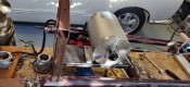 In the back and the front, I build stands/brackets to hold the body shell, and later on attach the bumpers. Never underestimate the destruction power of an overexcited 5 yo. I add a plate to bolt the motor on, then it's primer, two coats of dark gray, and the chassis is ready.