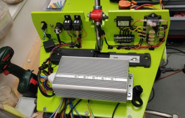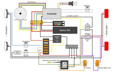 I install a voltage reducer to get 12V from the battery 48V, and put a fuse box to power each of the elements :