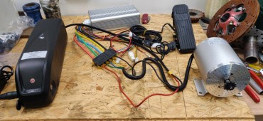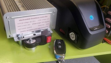 The motor kit comes with a controller, a throttle pedal, a key-activated main switch, a 3 positions selector to limit the speed (not a bad thing to have when giving the bloody thing to a little boy), the sprocket and chain...