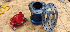 I start with a 20€ disc-brake kit for bikes, mechanically actuated, not hydraulically. First because again, I'm not making a racing go-Kart, but also the maintenance will be much easier, limiting the risks of seizing (not even mentioning cost).