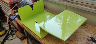 Sanding, gesso, some more sanding, and two coats of glycerophtalic paint using a foam roller (flashy green, but I had the pot left on a shelf).
