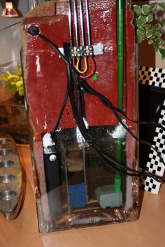 OK, now the structure is done, it's high time to stick it into the tank, silicon-gluing the bottom part. I've made 2 plexiglas walls for the decanting system. A 10 watts Newattino thermostat will keep the water at 25°C.