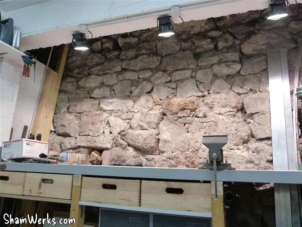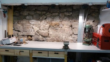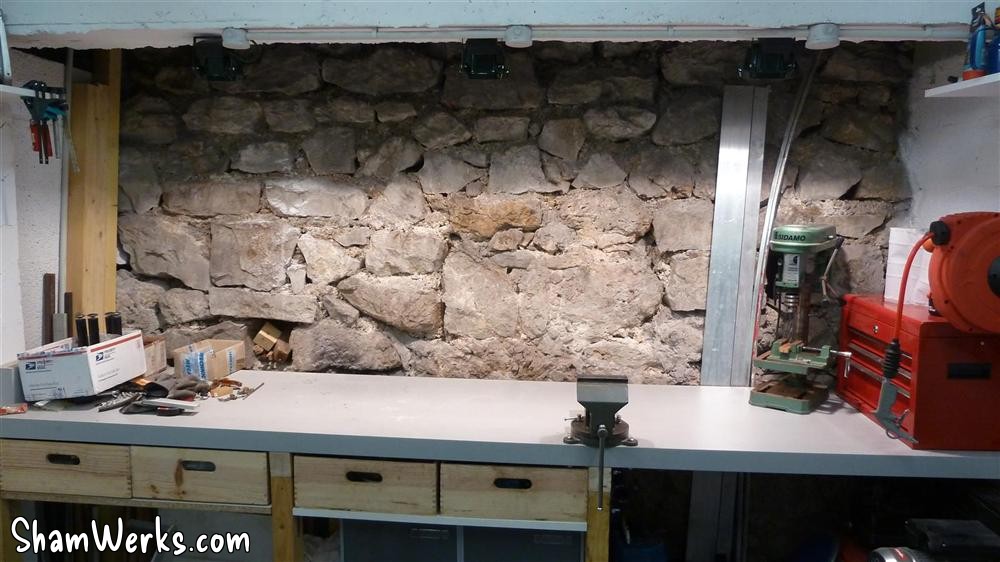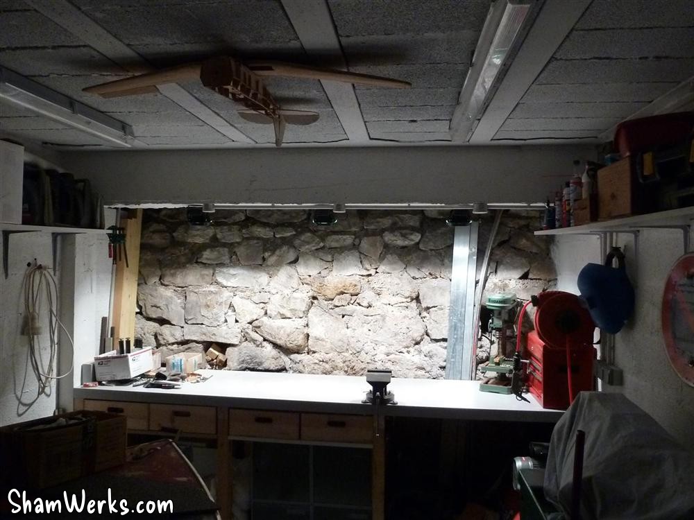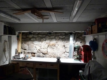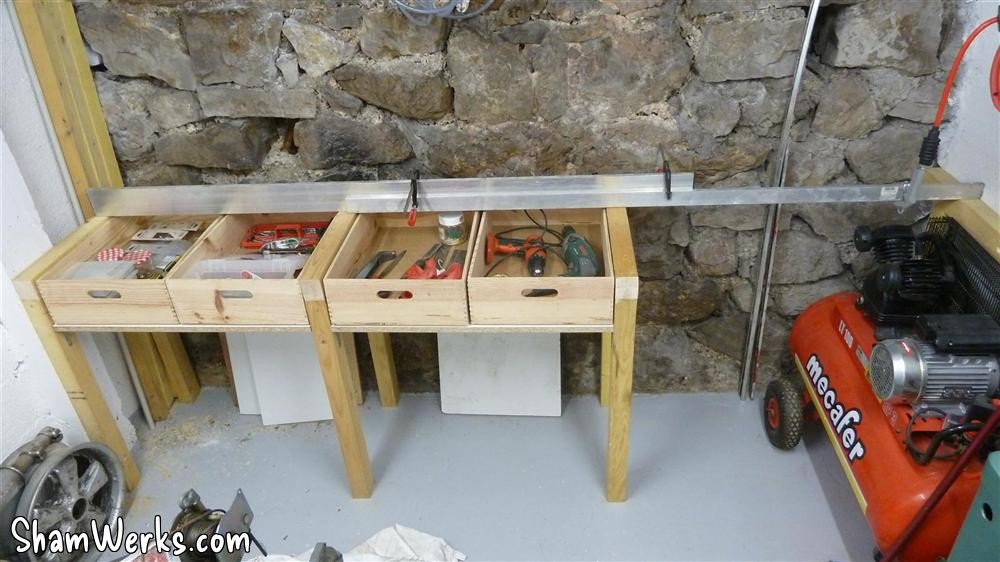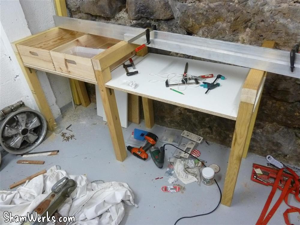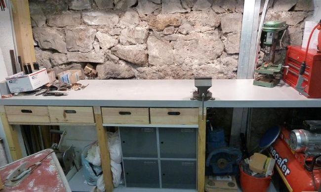 I'd prefer a proper counter top made of an assembly of lerge lumber pieces, planed all together... But I don't have the room, nor the time, to go into such a project. That'll wait till I have a real workshop! 😉 I've modified the lights above the workbench, compared to the original plan : the halogen lights tended to dazzle more than actually light up the bench. Plus, they would have been in the way if I want to store lrge stuff above (and since I have a project for that...).