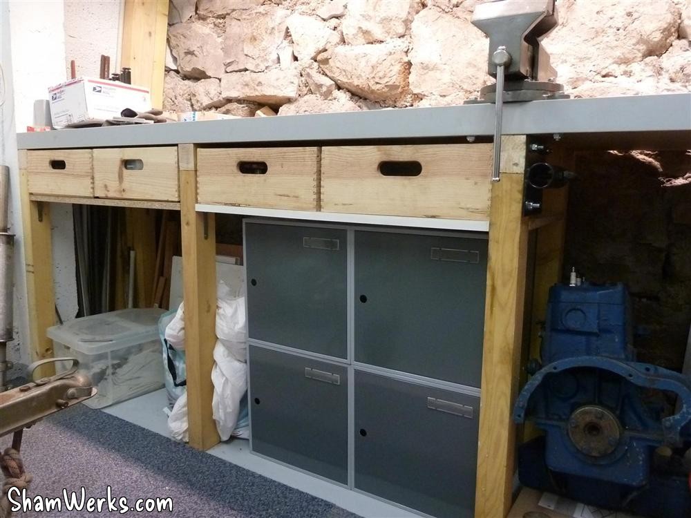 The 4 bottom metal cases I found in the trash bin (seriously, there were 50 of them, brand new!), and luckily they just fit below the drawers. Below the vice, you can see the VW engine support, fixed on the side of the wooden stand. Phew, good thing it's done, I started to have enough with that renovation! 😁