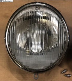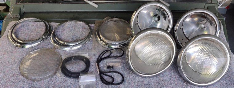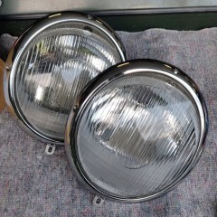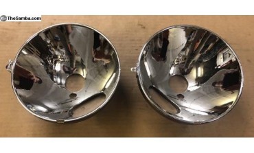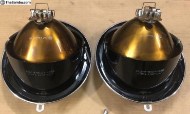 So I ended up falling for a pair of complete "correct period" headlights bought at high price in Hungary, from a specialist who restores them to perfection (akomjathy, see his ads on TheSamba ): supports sandblasted and epoxied, buckets mediablasted and powdercoated to silver, zinc-plated hardware, new seals, re-chromed rims... Beautiful, gorgeous parts, cf. photos from TheSamba ad below: