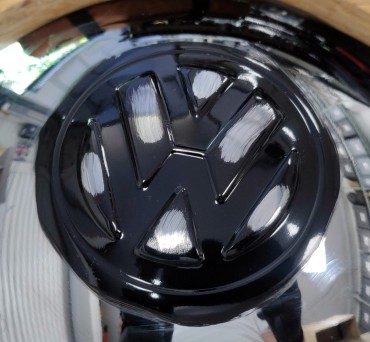 I wanted the VW logos painted black like they were originally. I did so using the "spray & swipe" method:
