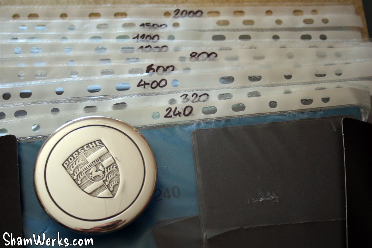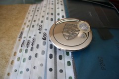 Le premier point est de ne pas de tromper dans l'ordre des papiers abrasifs utilisés : je me suis organisé une pochette classée avec les différents grains, déjà découpés à la bonne taille, pour me faciliter la tâche (cf. photo de droite).