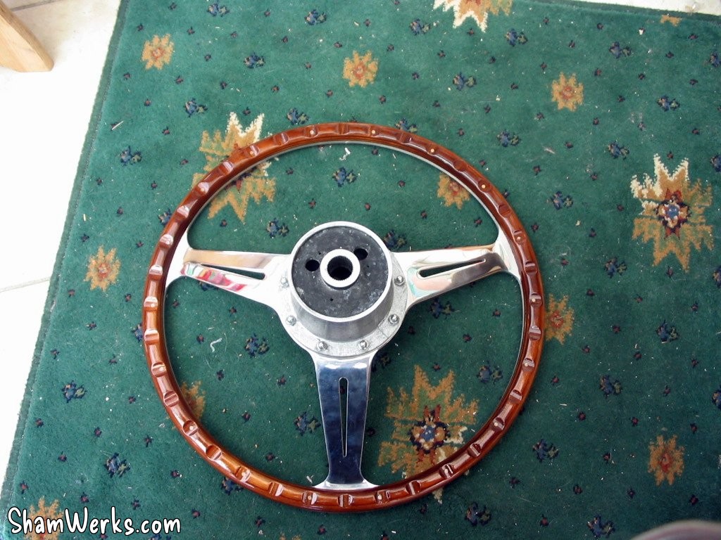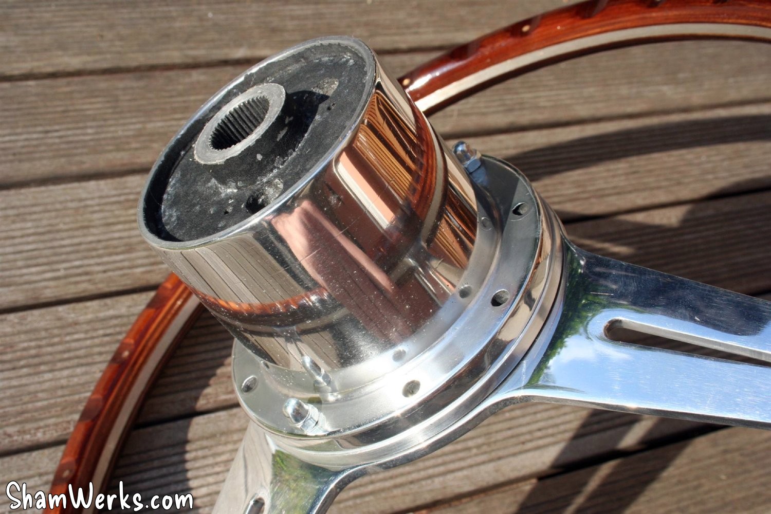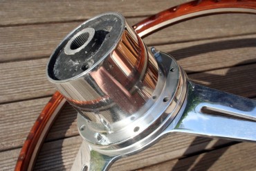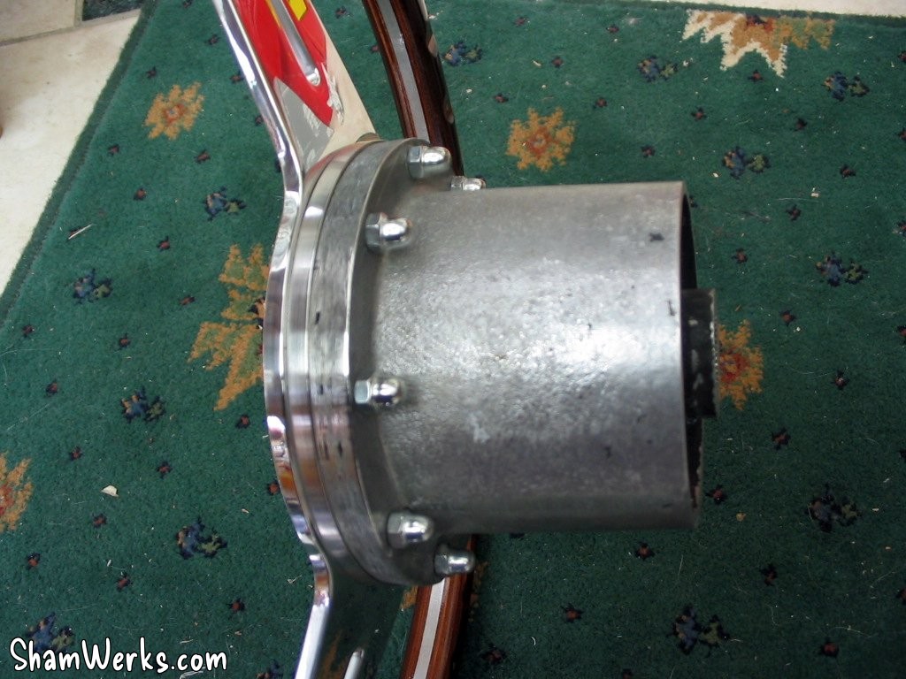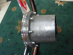 Tant que j'étais lancé, j'ai aussi poli l'adaptateur de mon nouveau volant! Il présentait de grosses aspérités, je l'ai monté sur le mandrin de ma perçeuse, elle même fixée à l'établi, et j'ai réussi à récupérer un état de surface acceptable avec une grosse lime plate.