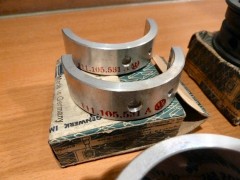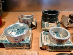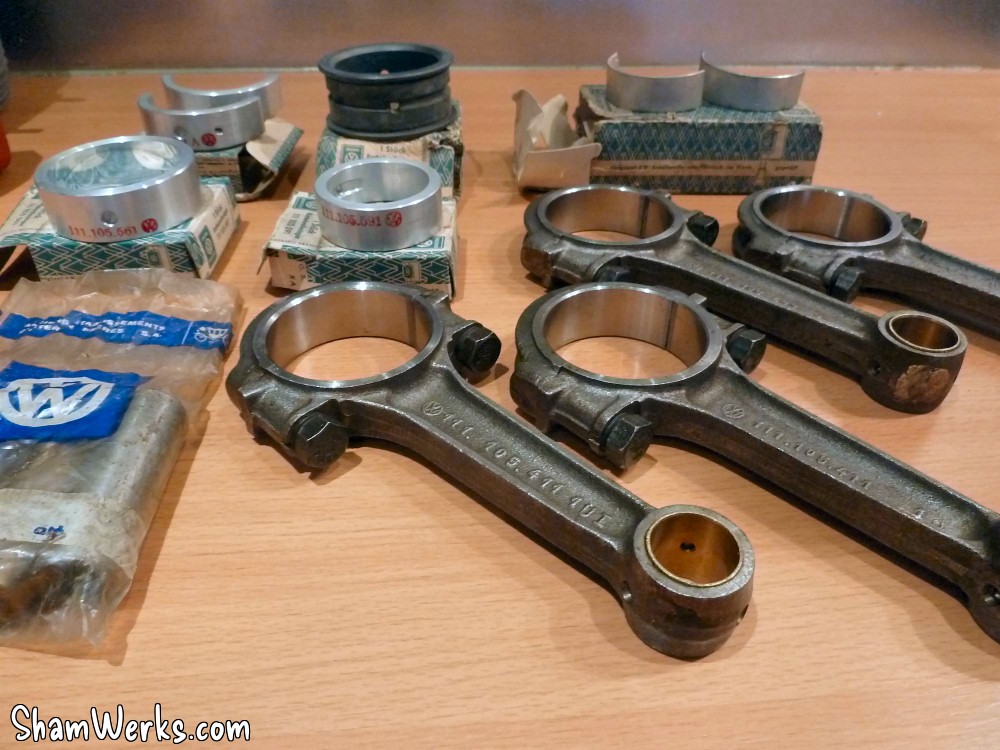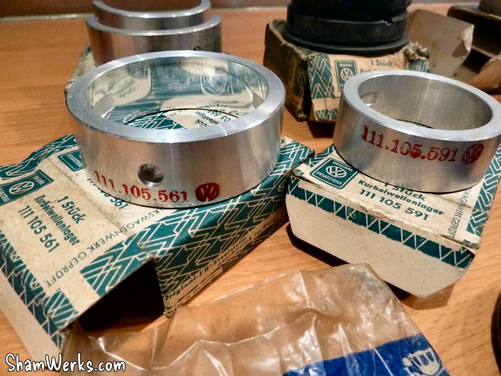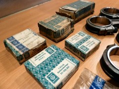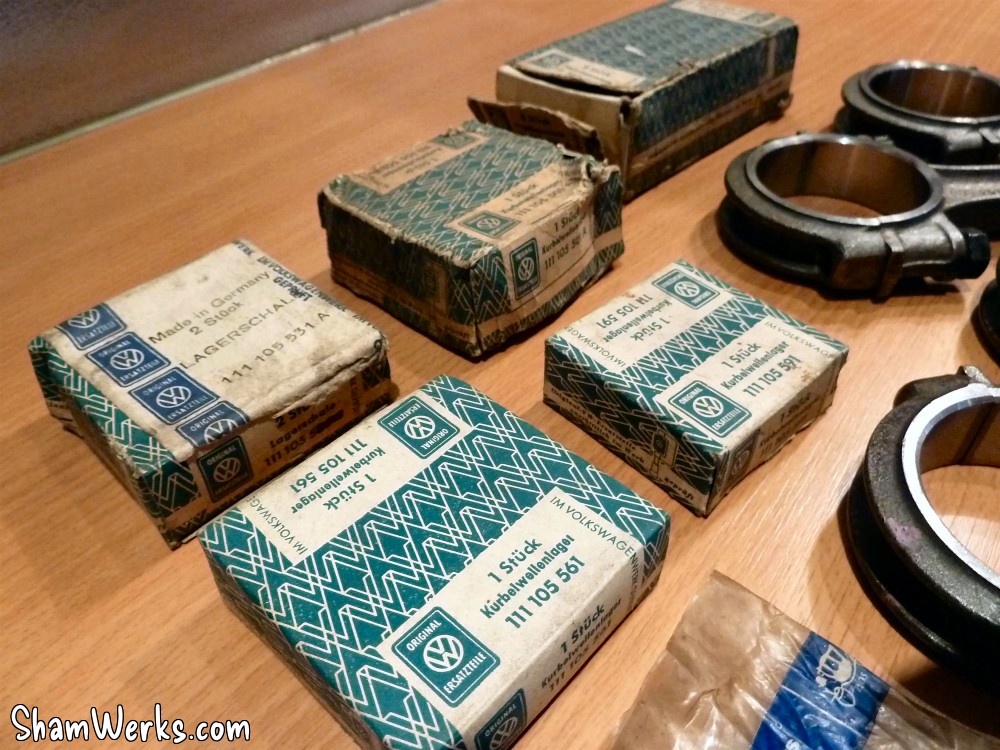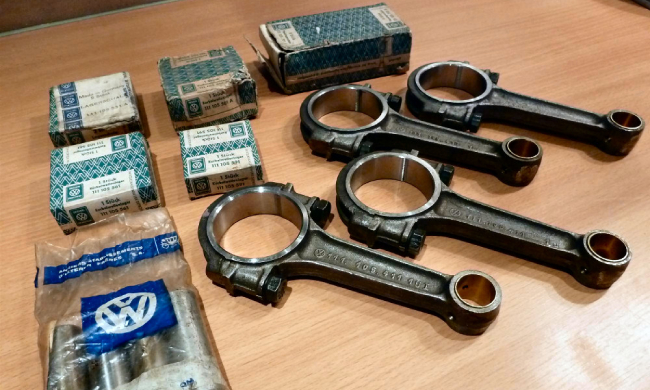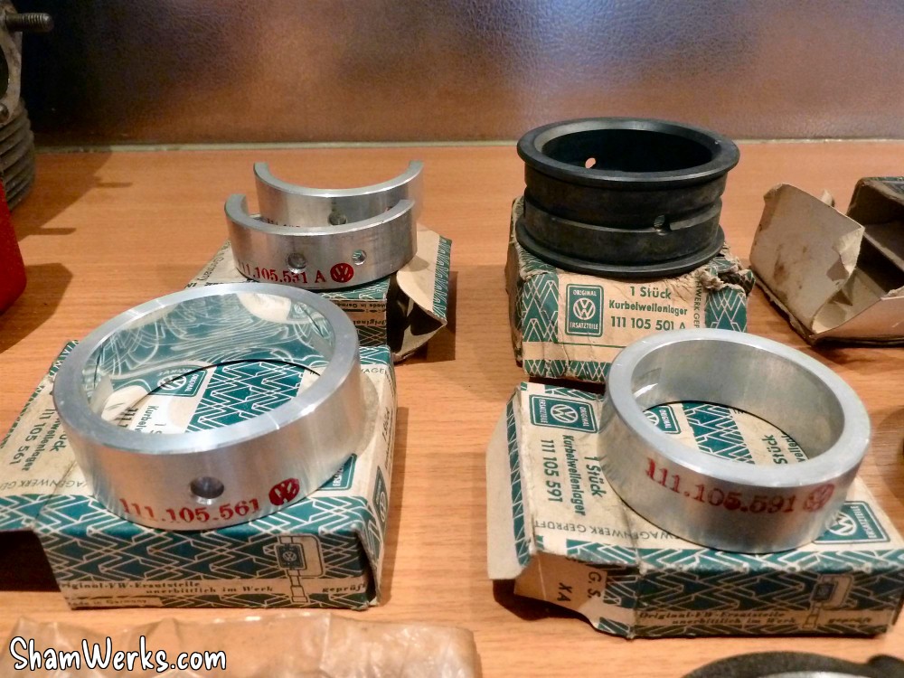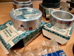 A gauche, vilebrequin occasion contrôlé (merci E. Simon), pas du NOS mais nickel, dans les côtes ; au passage avec, un jeu de poussoirs/tiges contrôlés eux aussi. A droite, l'AAC Okrasa Joe Ruiz. Mon volant moteur ayant ramassé, j'ai dû lui trouver un remplaçant : voilà la bête, un peu oxydé, il mérite une rectification ; par contre, les logements des pions sont nickels. Un nettoyage rapide à la paille de fer et il devient plus ou moins présentable. J'en profite pour reprendre au taraud M8 les taraudages de fixation du mécanisme d'embrayage : impossible d'y mettre une vis, entre la rouille et ce qui semble être un reste de pâte frein filet... Bielles VW NOS, coussinets bielles NOS, coussinets vilebrequin NOS, axes de pistons NOS. Je mets au défi tout amateur de vintage de ne pas avoir un début d'érection devant ces photos là! 😉