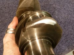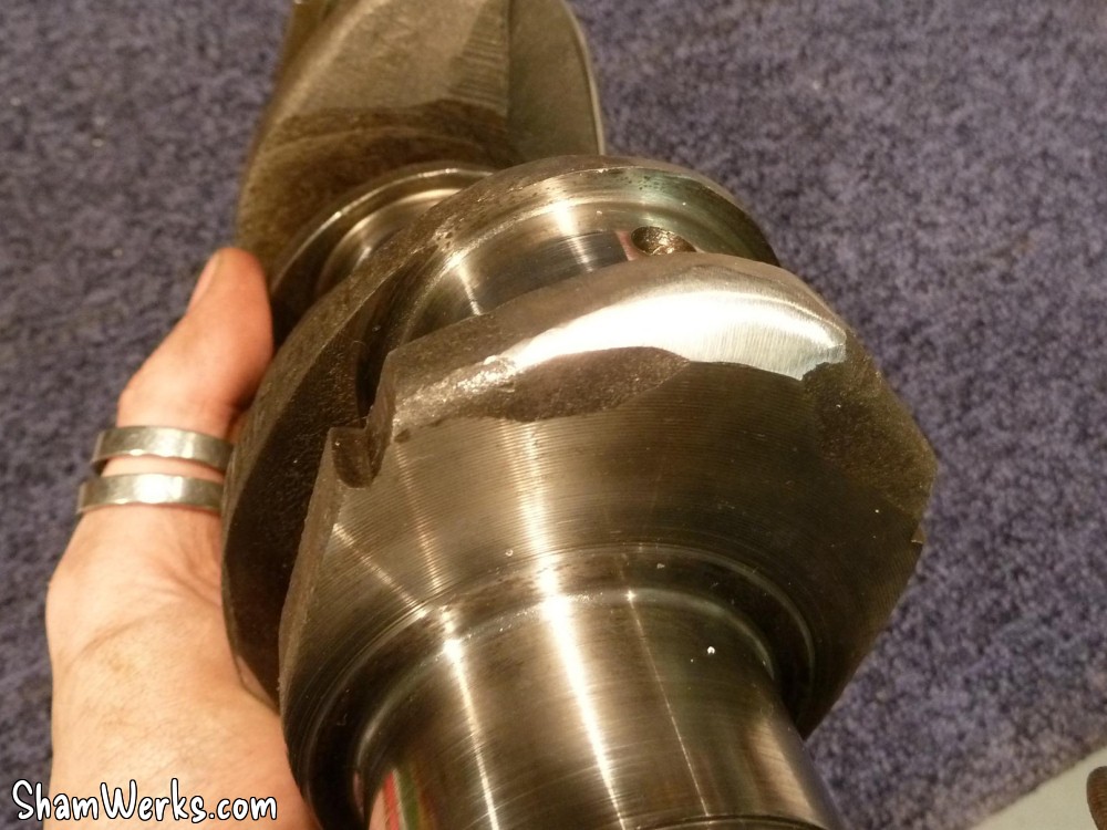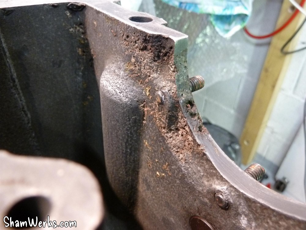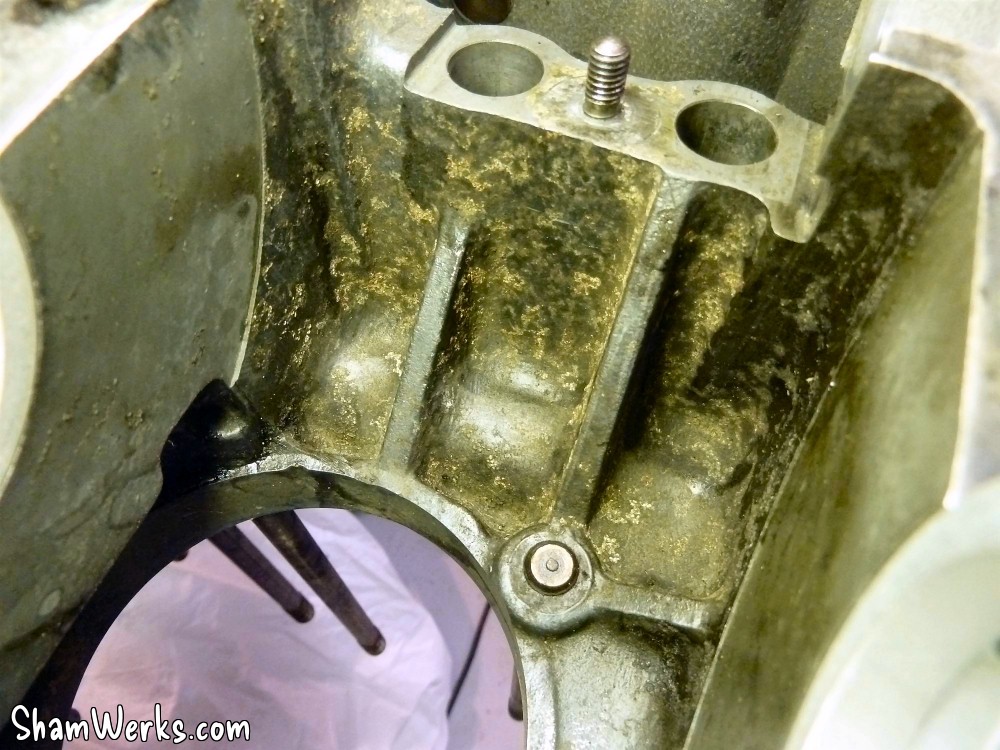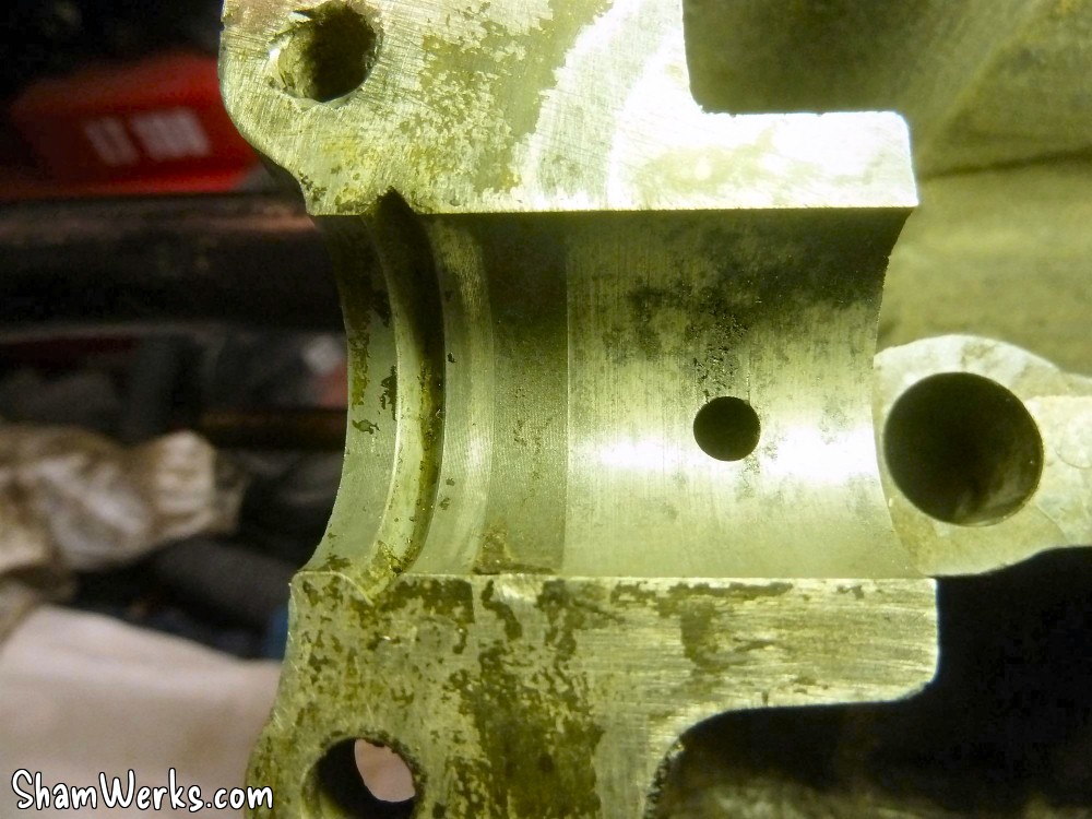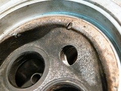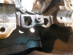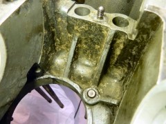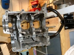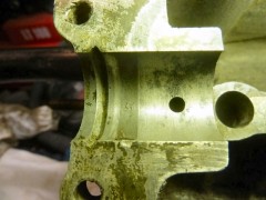 Pour bosser propre, j'ai commencé par nettoyer le carter de fond en combles.Bac, pinceau à dégraisser, brosse à dents, Scotch Brite, WD40 pour commencer, puis dégraissant métaux (produit GSB, nouvelle formulation minable par rapport à l'ancienne...), essence F, Kärcher eau chaude (Elephant Bleu power), et enfin un coup de nettoyant freins pour sécher le métal. Toutes les galeries sont rincées au nettoyant frein, puis soufflette, à plusieurs reprises. Au chapitre des mauvaises nouvelles, le bloc est bien corrodé en dessous. Ça ne remet pas en cause l'étanchéité, ça ira bien comme ça. Le dernier palier d'arbre à cames (pas de coussinets d'AAC sur pied moulé!) coté VM est légèrement piqué. Rien de bien méchant, et l'ancien arbre n'était pas marqué, je laisse comme ça. Finition extérieure : j'avais pensé microbiller l'ensemble, mais j'ai lu que c'est à éviter, il est très difficile de nettoyer ensuite les microbilles dans les galeries et les recoins du bloc. Et si ça commence à se balader dans le circuit d'huile, les effets peuvent être désastreux, je ne prendrai donc pas le risque.