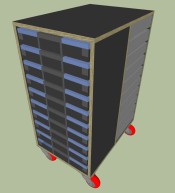 Je commence par un design sous Sketchup (sans surprise si vous êtes déjà passé par ici) : sur le devant mes nouveaux organisateurs, et à l'arrière autant de bacs plats de mêmes dimensions pour la boulonnerie en vrac. Et si besoin par la suite, je pourrai remplacer tout ou partie des bacs plats avec d'autres mallettes.