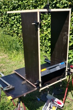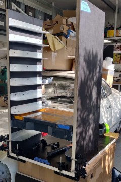 La structure sera en contreplaqué, les mallettes et bacs étant supportés par des cornières en aluminium vissées dans les flancs.
